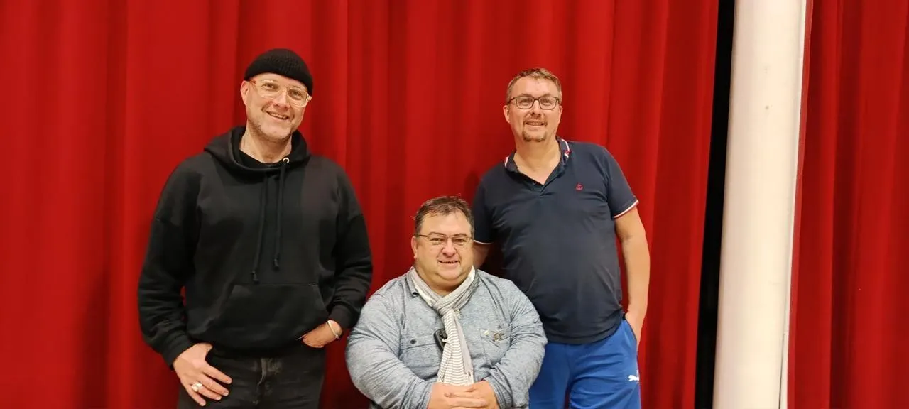 Le réalisateur chorégraphe Philippe Ménard (avec le bonnet), Jean-Guy Bret, Président d'Action Handicap Vendée et Olivier Carpentier, patient et acteur dans le documentaire "Dis moi sur quel pied tu danses." Tous trois réunis après la projection du film au Cinéma Belle Epine de la Châtaigneraie. © Ouest-France