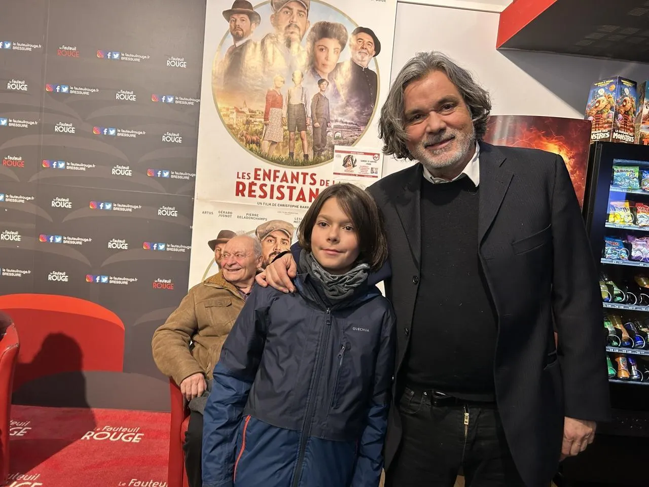 Bressuire, Le Fauteuil rouge, samedi 10 janvier. Le réalisateur Christophe Barratier pose aux côtés de Sacha, un jeune fan venu voir son film avec dix autres membres de sa famille. © CO - Guillaume RAINEAU