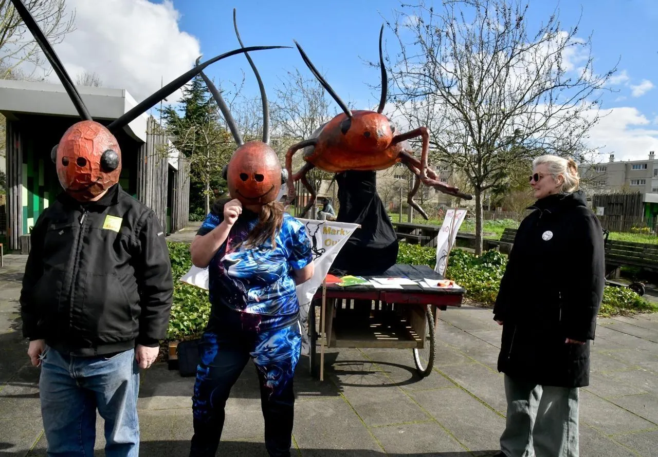 La présence de cafards dans des logements sociaux, au Clou-Bouchet, a de nouveau mobilisé des locataires autour d’un cafard géant en résine, spécialement fabriqué pour l’occasion. © CO - Marie Delage