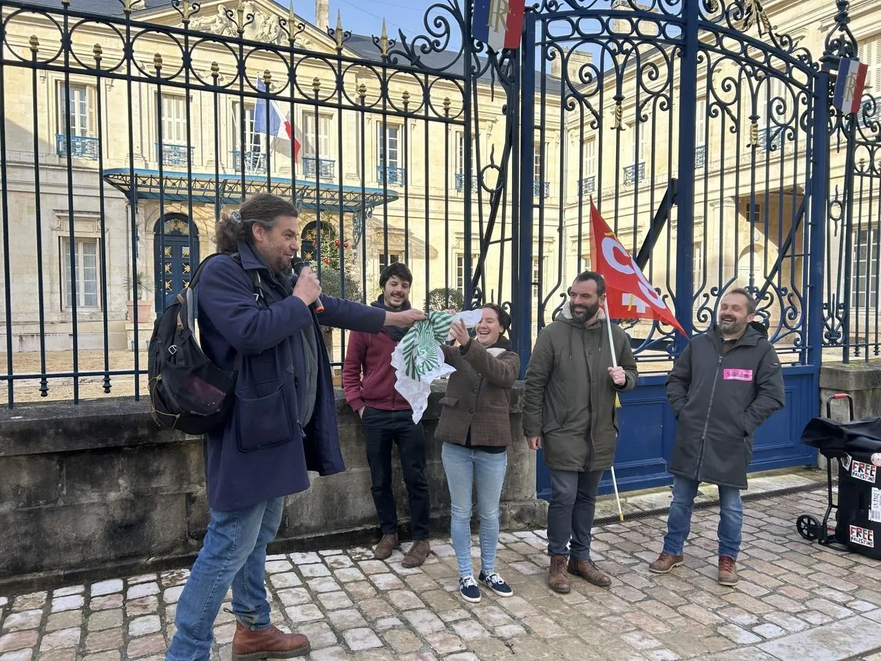 Porte-parole de « Bassines non merci ! », Julien Le Guet a détendu l’atmosphère en offrant un drapeau de la FNSEA à Amandine Pacault, « un totem d’immunité pour ouvrir les portes des ministères », a-t-il plaisanté. © CO - Julien RENON