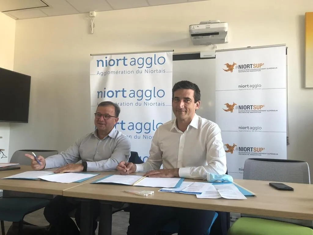 Jean-Marc Ogier, le président de l’université de La Rochelle, et Jérôme Baloge, maire de Niort et président de Niort Agglo, ont renouvelé leur convention pour l’année à venir. CO
