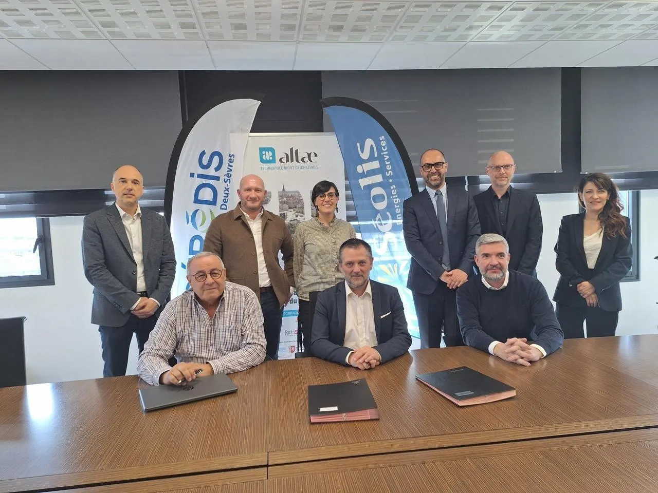 Signature du partenariat Altae – Séolis - Gérédis de gauche à droite : Jérôme Limosin, Jean Redien, Alexis Nault, Perrine Doret, François Guyon, Sébastien Guindet, Yannick Pilpay, Jean-Luc Lemoine et Carole Laverré. © Séolis