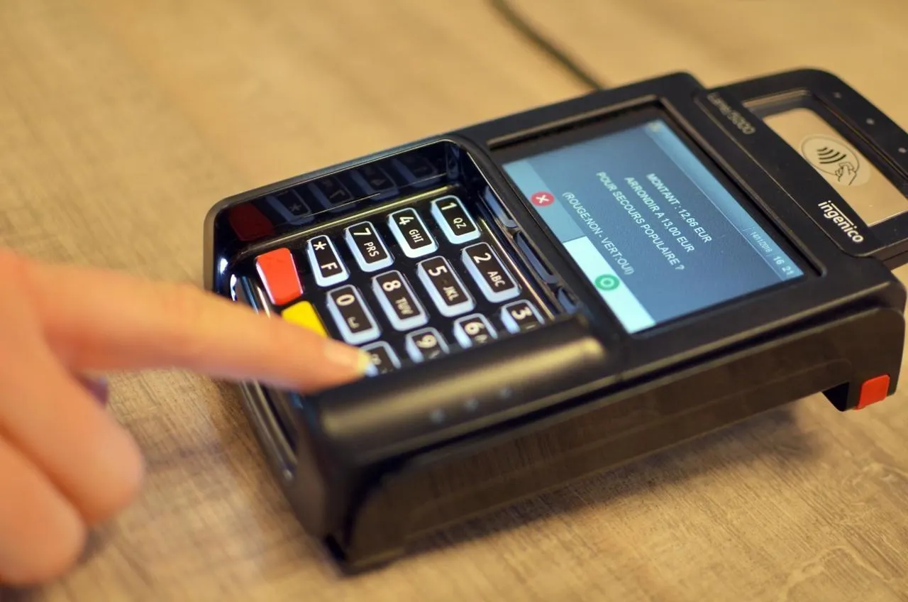 photo  avant de payer, on nous propose parfois d’arrondir à l’euro supérieur, en cliquant sur le bouton vert du terminal de paiement.  ©  microdon 1