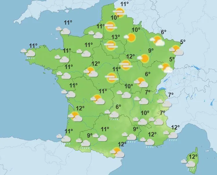 Côté températures, les minimales sont comprises entre -2 et 2 °C de l’Auvergne au Nord-Est et jusqu’à 6 à 9 °C près du littoral. « Les maximales affichent 8 à 12 degrés sur le pays », précise Météo-France.