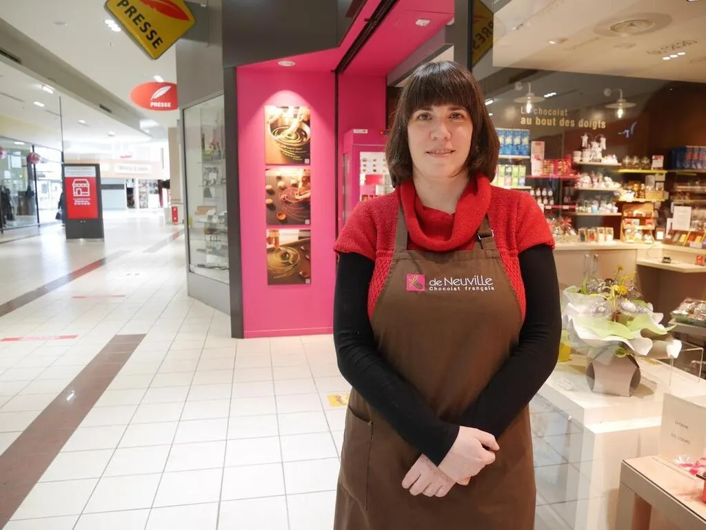 Karine Neau, gérante de la boutique de chocolats De Neuville, a continué à officier dans la galerie déserte, depuis début février. © CO – Gabin CHAMEREAU