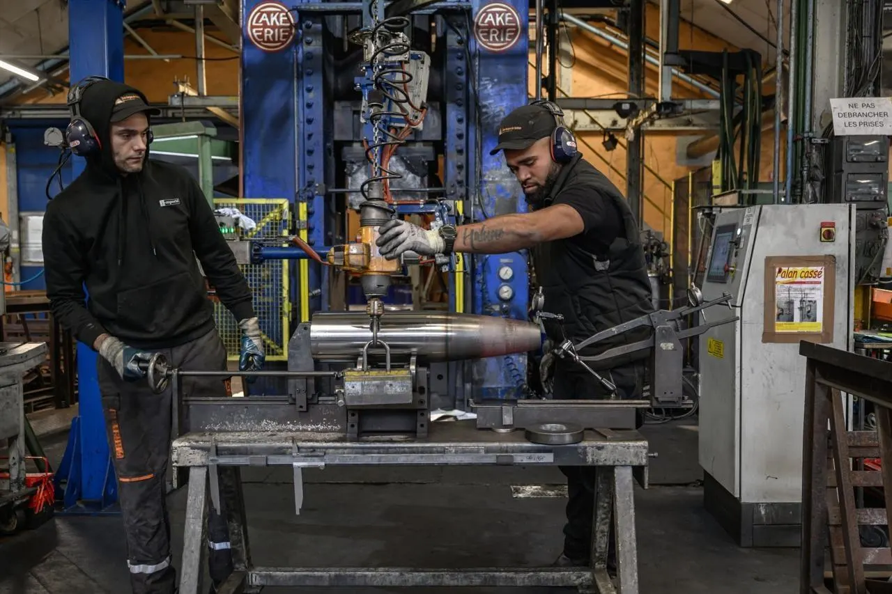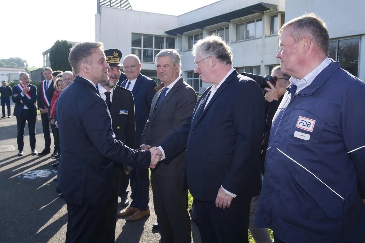 En mai 2025, Marc Ferracci, ministre de l’industrie (à gauche), en visite à la Fonderie de Bretagne, serre la main de Jérôme Garnache-Creuillot, PDG controversé d’Europlasma. © Thierry Creux / Ouest-France