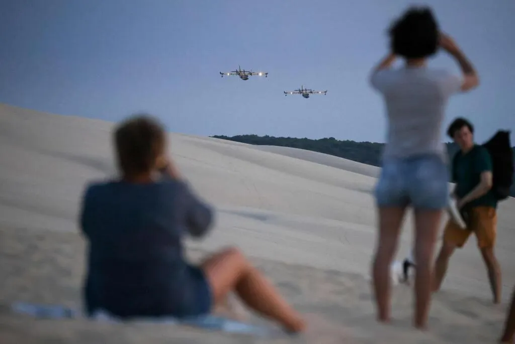 Des personnes prennent des photos de Canadairs survolant la dune du Pyla à La Teste-de-Buch, en Gironde, le 14 juillet 2022. © THIBAUD MORITZ / AFP