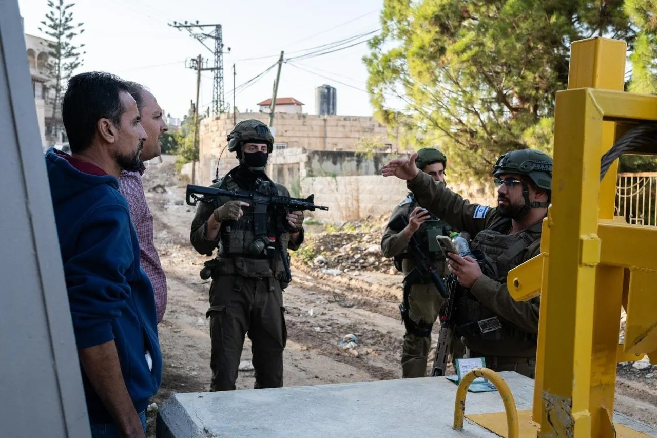 Le 27 novembre 2025, un soldat de l’armée d’occupation israélienne contrôle deux Palestiniens à l’entrée du camp de réfugiés de Jénine, en Cisjordanie occupée. © ARUALLAN / Hans Lucas via AFP