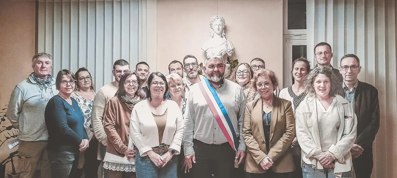 Le maire Laurent Dupuis, entouré du conseil municipal renouvelé avec 16 nouveaux conseillers et trois de la mandature précédente. © CO