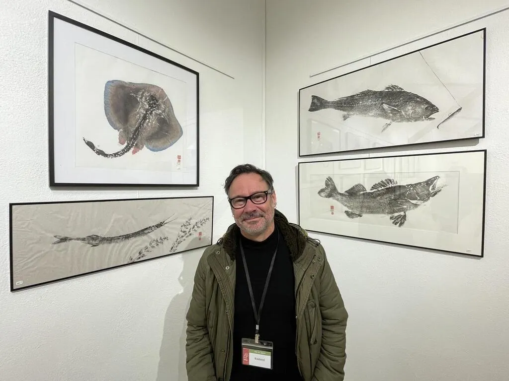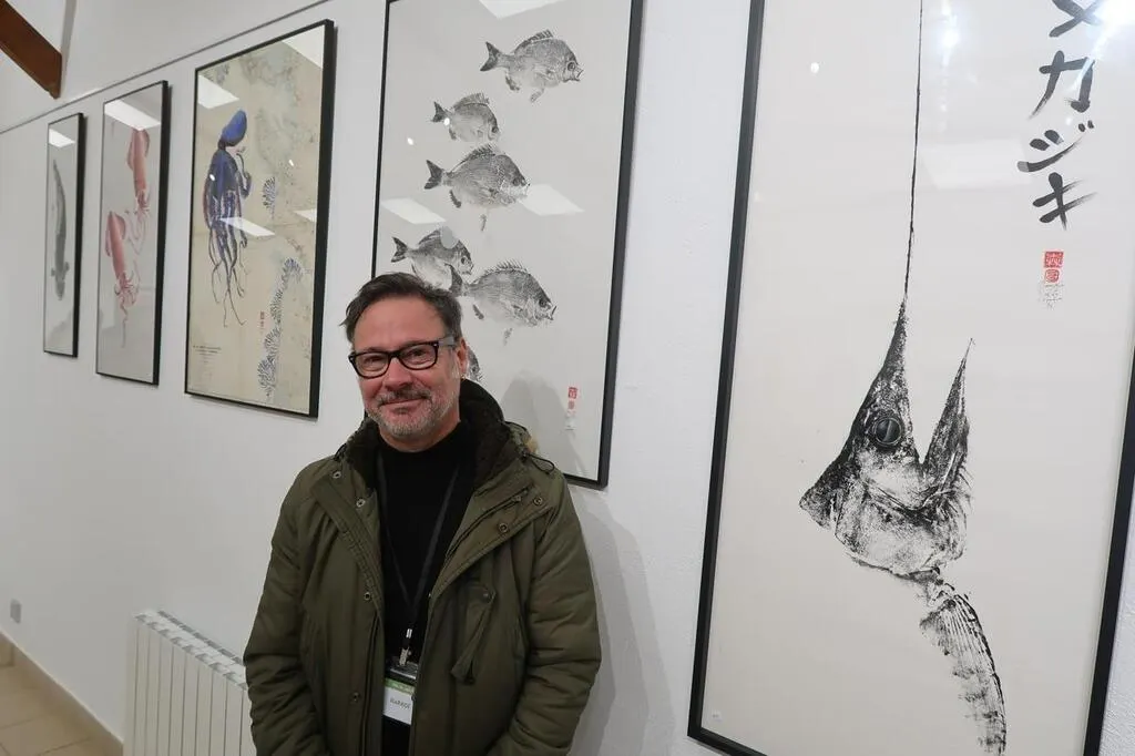 Maulévrier, Parc oriental, samedi 9 novembre 2024. Sylvain Garrigues, alias Darkoï, présente ses « gyotaku » réalisés à l’encre de Chine jusqu’à lundi. © CO - Fabien LEDUC
