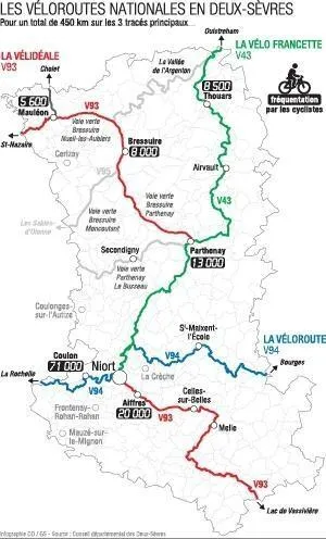 Le département des Deux-Sèvres est traversé par trois véloroutes nationales. La plus célèbre est la VéloFrancette (Caen-La Rochelle), bien ancrée dans les esprits. La Vélidéale (Saint-Nazaire-Lac de Vassivière), quant à elle, est moins réputée dans la mesure où elle n’a été officiellement lancée qu’au printemps dernier. La V94, reliant Bourges à La ...