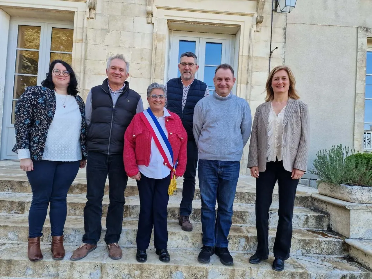 Marie-Pierre Missioux, réélue maire, entourée de ses adjoints (de gauche à droite) Émilie Morin, Patrick Salgues, Frédéric Bourget, Ludovic Poissonnet et Séverine Albertino. © CO