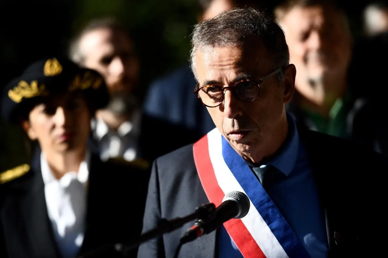 Le maire de Bordeaux, Pierre Hurmic, prononce un discours lors de l’inauguration d’une place portant le nom du professeur Samuel Paty, le 16 octobre 2023. © CHRISTOPHE ARCHAMBAULT/AFP