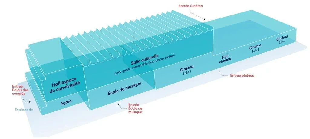 Selon ce visuel, les salles de cinéma seraient de plain-pied et la salle culturelle au premier étage. L’inverse était trop coûteux. © Ville de Parthenay