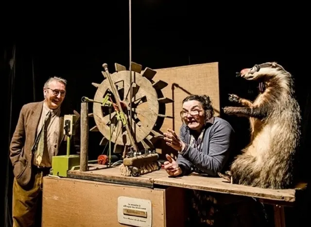 Autour des moulins, on a créé une histoire et un spectacle. On a inventé Monsieur Noël, cantonnier à la retraite de Kerostrabell, village breton, qui est le gardien de cette collection. Je joue M. Romet, conservateur du Musée des curiosités, qui vient présenter les étranges moulins à Niort. Je suis accompagné de Sylvie Petit, de l’office de tourisme de Kerostrabell. Il y a un premier temps de conférence. Ensuite, le public est invité a circuler parmi les moulins.