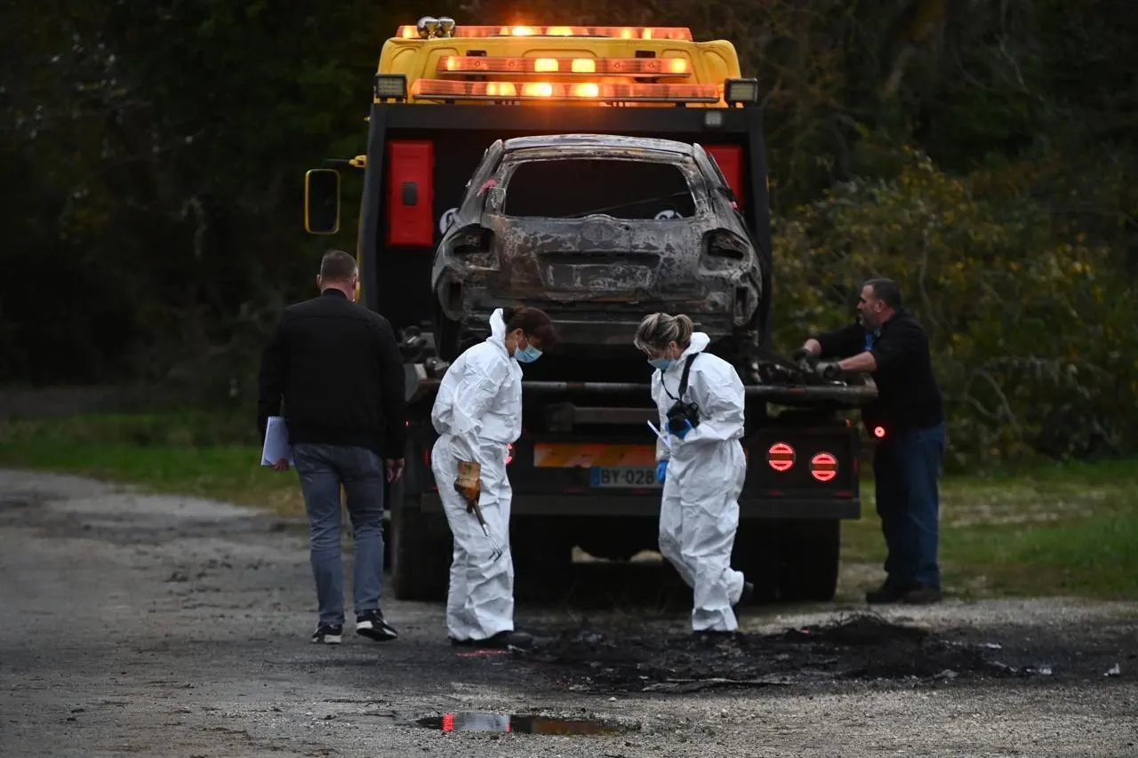 La police scientifique effectue des relevés sur la scène où a été retrouvée la voiture de l’homme suspecté d’avoir percuté plusieurs personnes volontairement à l’île d’Oléron, le 5 novembre 2025. © CHRISTOPHE ARCHAMBAULT / AFP