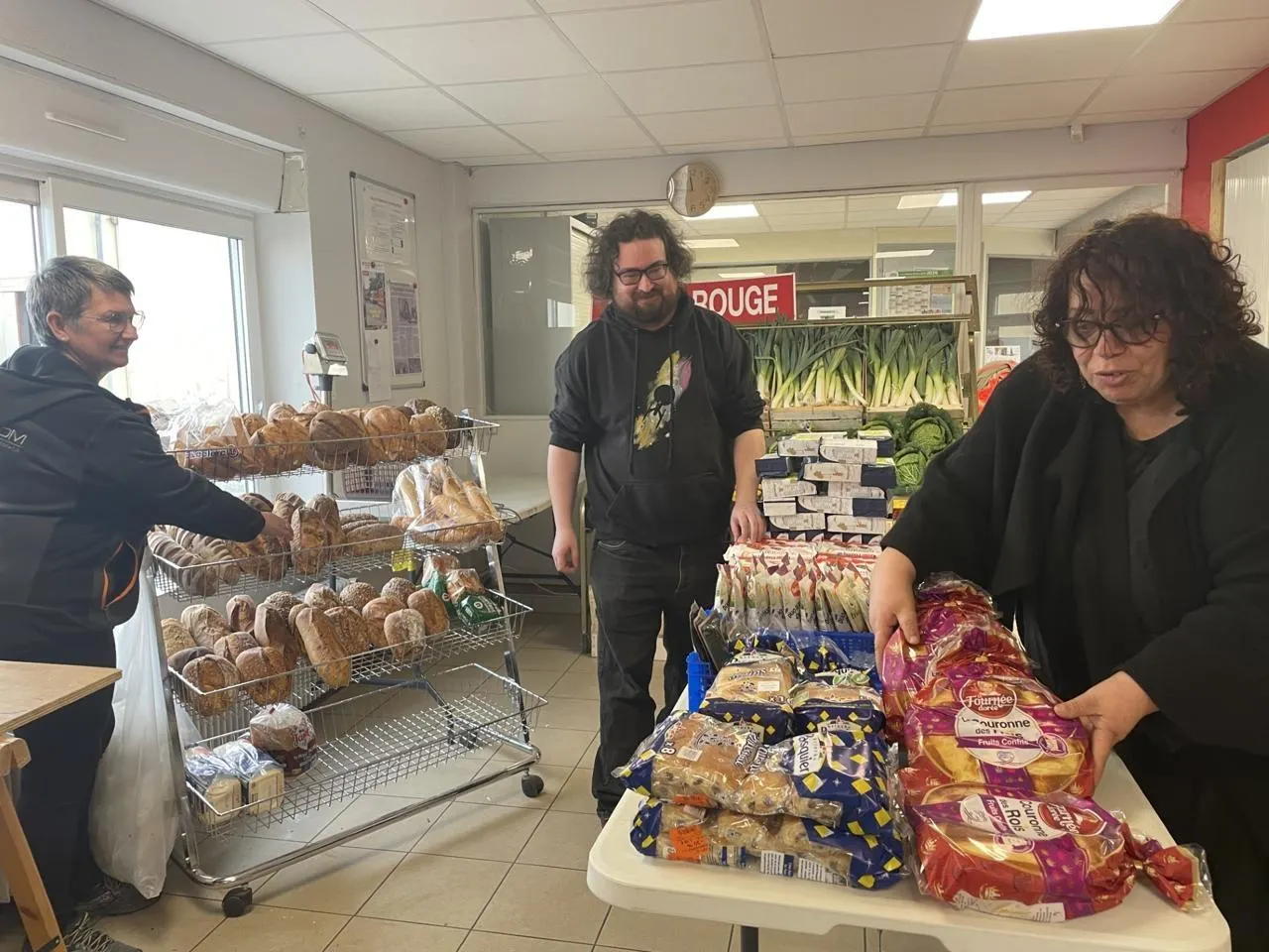 Jour de distribution alimentaire pour la Croix-Rouge de Parthenay. Ici, Patricia (à gauche), Benoît et Farida, la responsable. © CO – Lucas JARIAIS