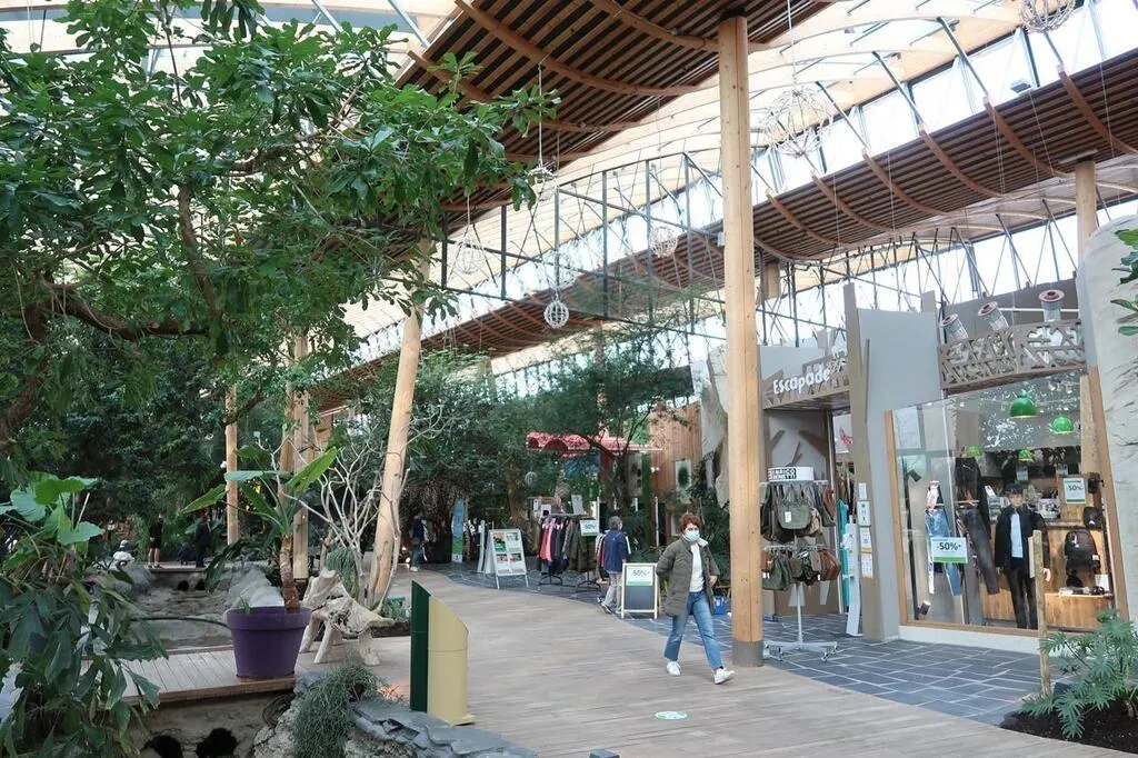 Petit village au centre du parc, la structure en bois abrite des restaurants, magasins et des espaces de détente. © CO