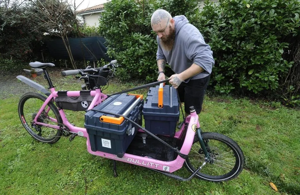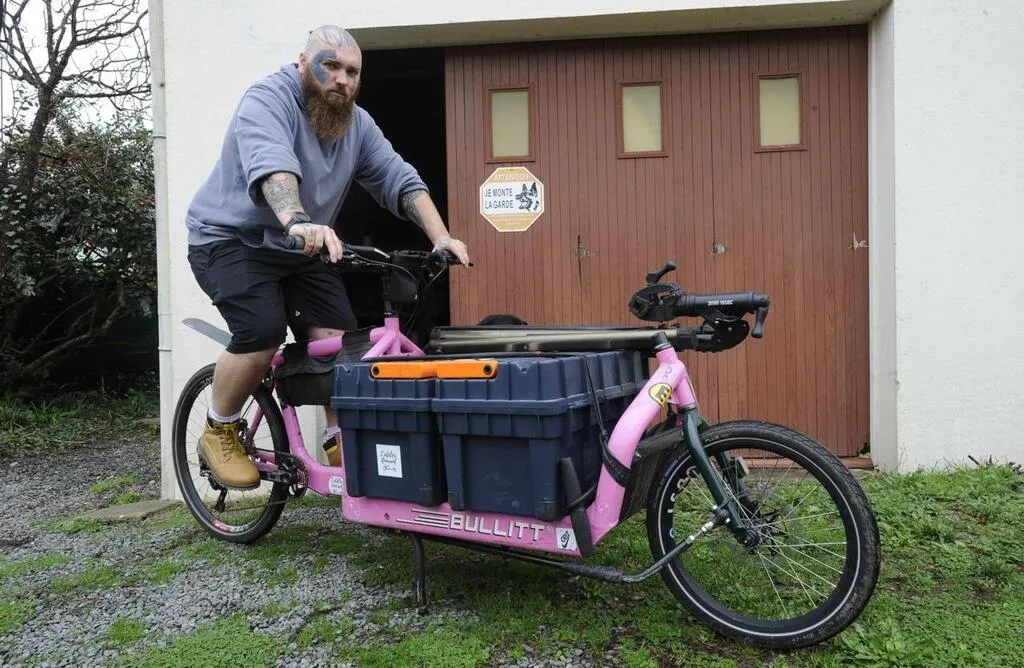 Sur son vélo-cargo rose, il se rend chez les Deux-Sévriens pour réparer leurs deux roues... |