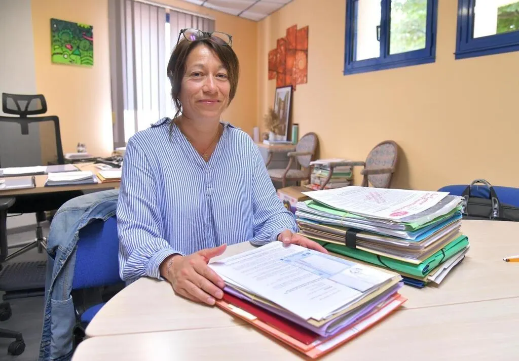 La première magistrate Patricia Rouxel, plongée dans ses dossiers, à son bureau dans la mairie de Mougon. © CO - Marie DELAGE