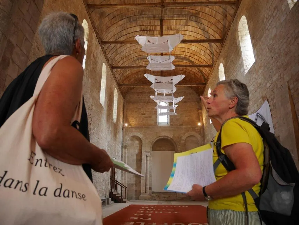 Les visites guidées s’enchaînent à Melle, notamment dans l’église Saint-Savinien qui accueille plusieurs Å“uvres dont « Train de cerfs-volants Saconney », de l’artiste Laurent Montaron. © CO - Gabin CHAMEREAU