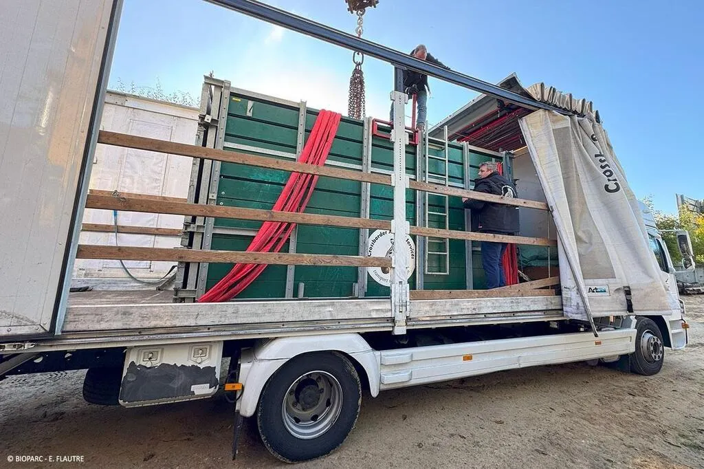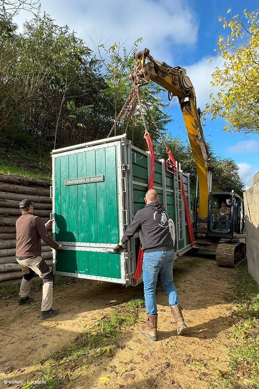 Doué-la-Fontaine, mercredi 23 octobre. La caisse adaptée aux rhinocéros pèse elle-même 2,5 tonnes. © E. Flautre - Bioparc