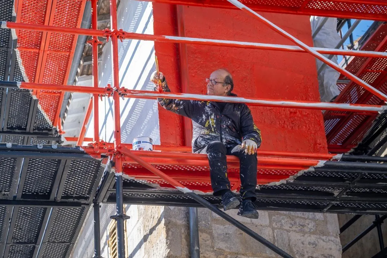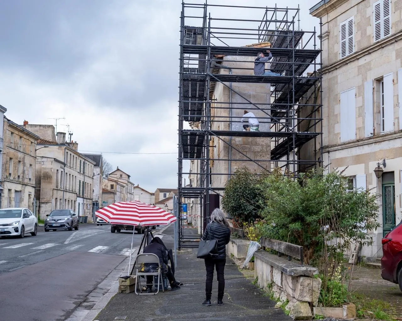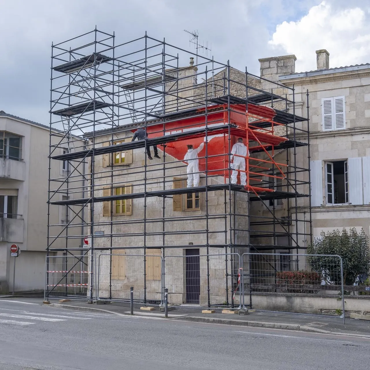 L’artiste Georges Rousse a intégré un échafaudage dans le travail qu’il réalise sur la maison gaufrette, à Niort, rue du 14-Juillet. La photo qu’il prendra du sujet peint sera son œuvre. © CO – Eric Chauvet