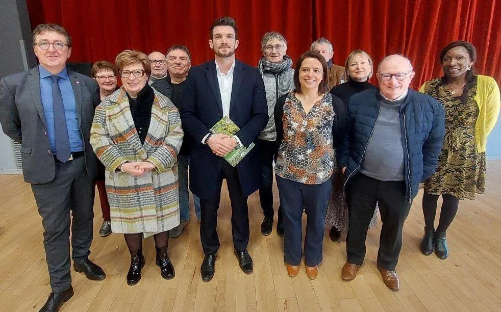 Au premier plan, de gauche à droite : Pascal Duforestel, Elisabeth Maillard, maire de Saint-Rémy (représentante de la CAN), le député Bastien Marchive, Lucy Moreau, maire de la commune, Christian Brémau, maire de Saint-Maxire (représentant de la CAN). Au second plan, les conseillers municipaux. © CO