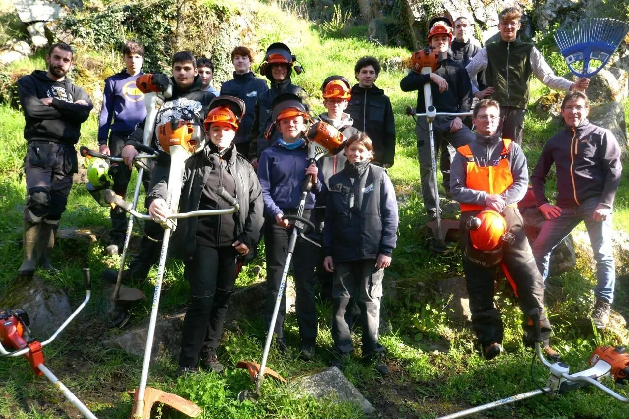 Les lycéens de la MFR-CFA de Saint-Loup-sur-Thouet, encadrés par Vincent Fleury (à gauche) et Guillaume Koch (à droite, en tenue de travail), ont entrepris un chantier de débroussaillage. À ses côtés, Eric Renault, co-président du MCM. © CO