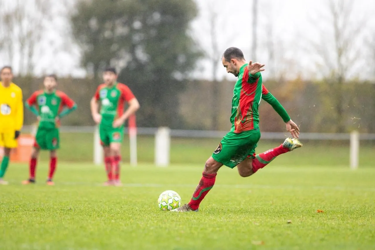 Ici contre Pays de l’Ouin, le 23 novembre, Quentin Chevalier s’applique à bien frapper un coup de pied arrêté de Saint-Cerbouillé. © CO - Clémence CHAUVIN