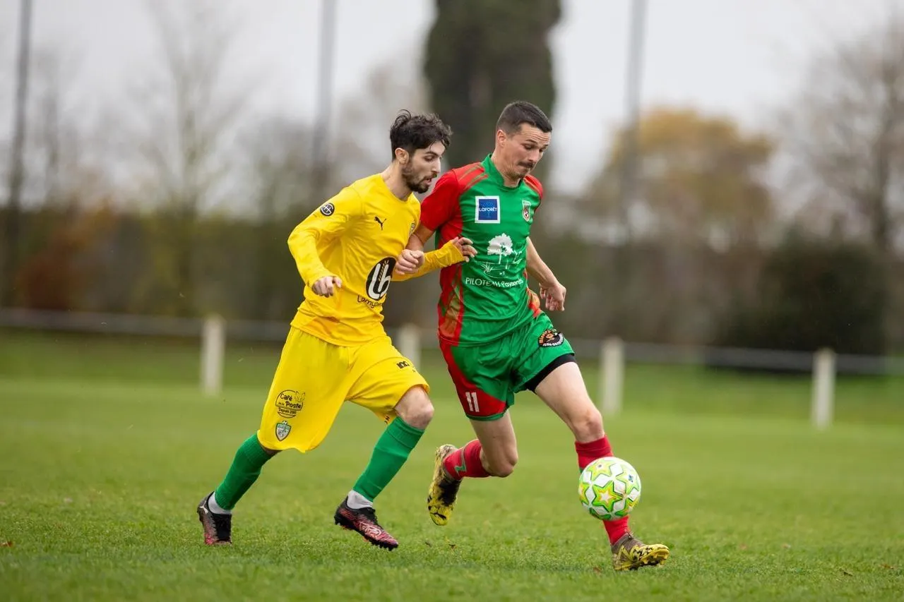 Au duel avec Clément Lormier, de l’ES Saint-Cerbouillé, Maxime Beaumard (FC Pays de l’Ouin) a pris goût au duel défensif depuis son repositionnement. © CO - Clémence CHAUVIN