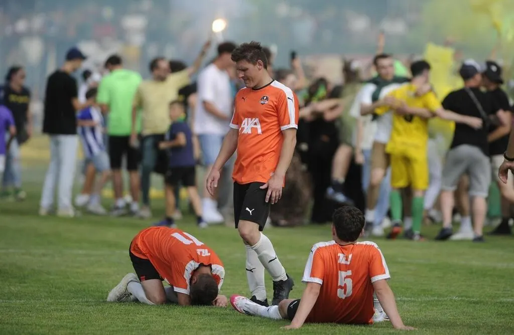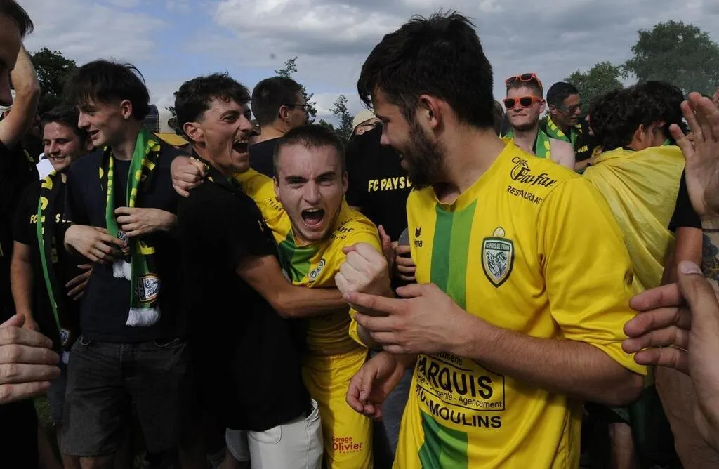 Entouré de ses supporters, Corentin Baron serre le poing : le FC Pays de l’Ouin vient de remporter la Coupe des Deux-Sèvres 2025. © CO - Christophe BERNARD