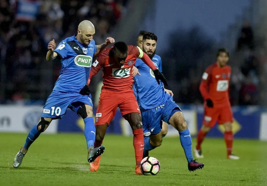 Laurent Agouazi et Jimmy Roye prennent Blaise Matuidi en tenaille. Ou l’image de Niortais qui ont mené la vie dure aux Parisiens. © CO - Marie DELAGE