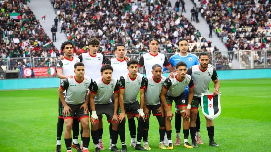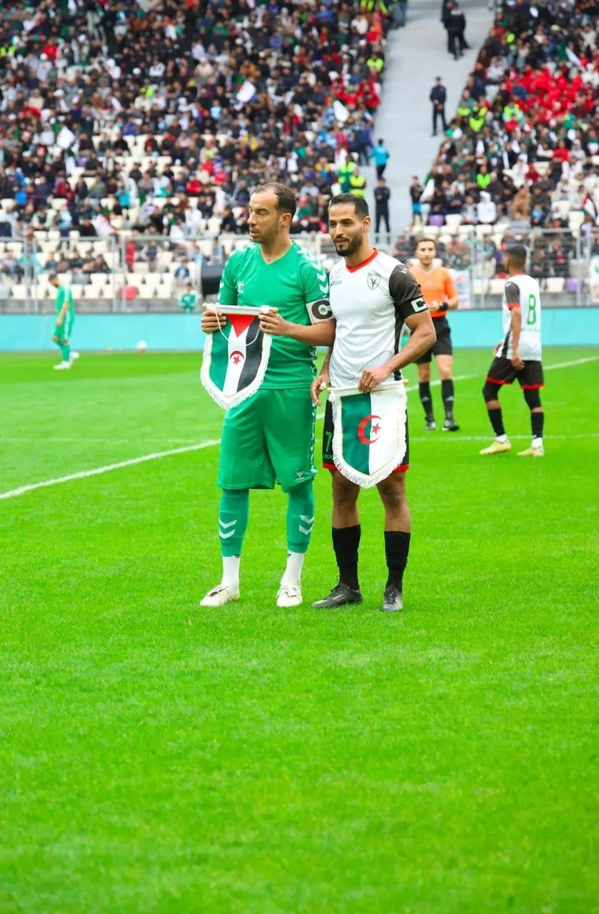 Le vendredi 13 février 2026, la sélection du Sahara occidental, emmenée par le capitaine Moulud Saïd Cheikh (à droite), ainsi qu’Ali Babouzid (1re ligne, 2e en partant de la gauche) et Bulahi Nan Soueilem (2e ligne, à côté du gardien), a disputé un match de gala au stade Nelson-Mandela de Baraki. © Fédération sahraouie de football