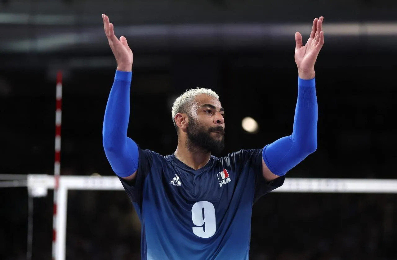 Earvin Ngapeth lors de la victoire de l’Équipe de France face à l’Italie aux Jeux olympiques 2024. © MATTHEW STOCKMAN / AFP