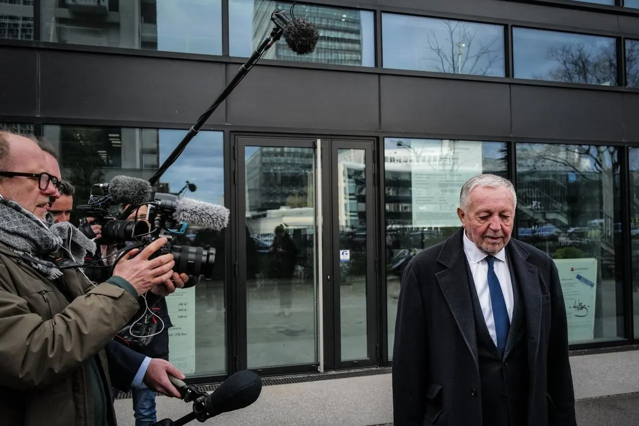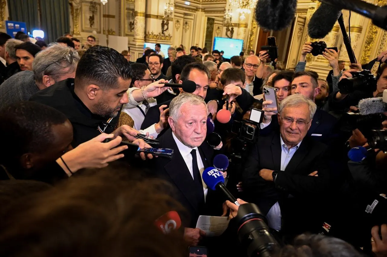 Jean-Michel Aulas, entouré par des journalistes à Lyon, le 16 mars 2026. © Olivier Chassignole / AFP
