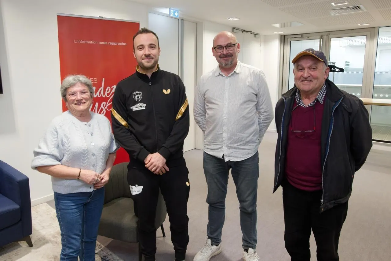 Simon Gauzy avec Evelyne, Stéphane et Jean-Paul. © Thierry Creux / Ouest-France