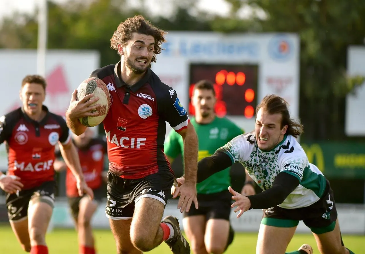 Anthony Lavaux échappe au plaquage d’un adversaire et s’en va inscrire le premier essai niortais. © CO - Marie DELAGE
