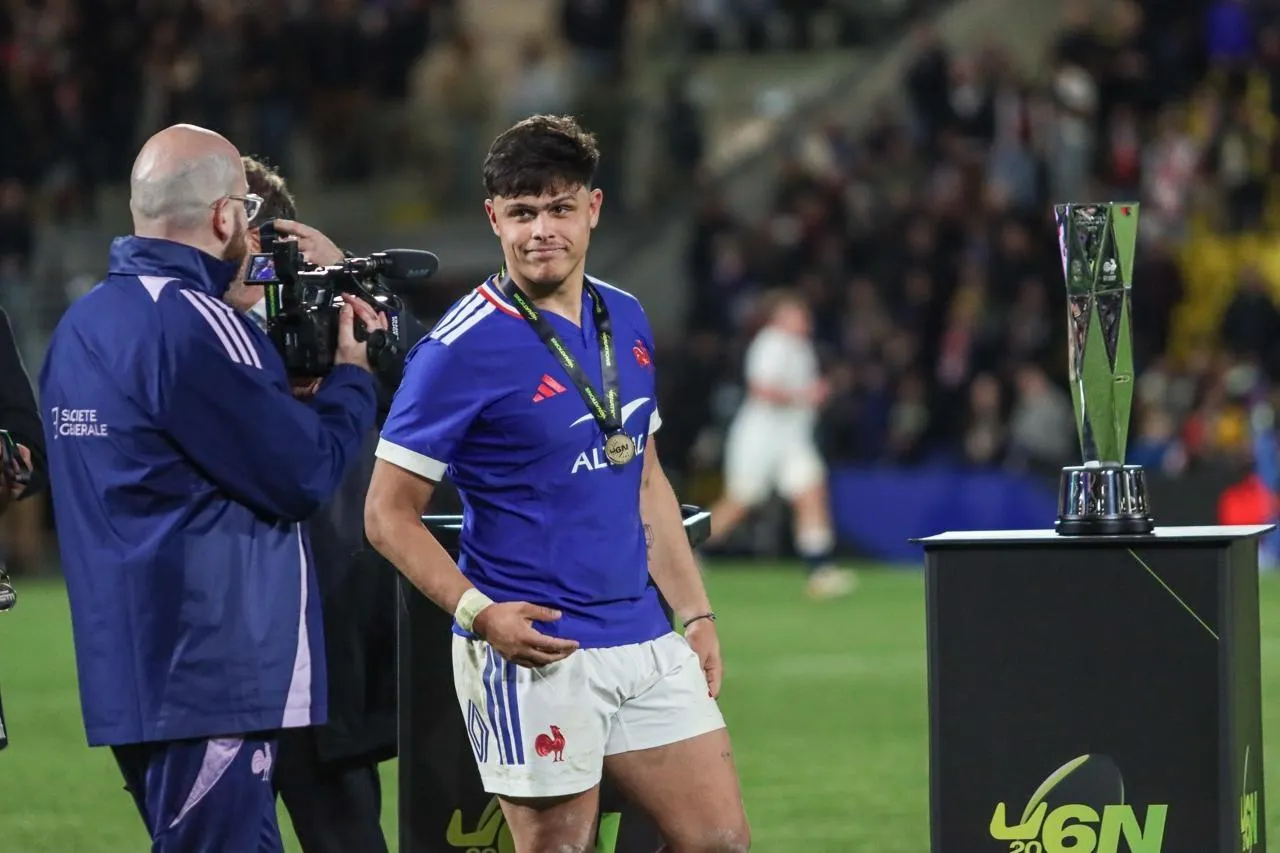 Gabin Garault, devant le trophée des 6 Nations brillamment remporté par les Bleuets. © CO - Jordan MAGNERON